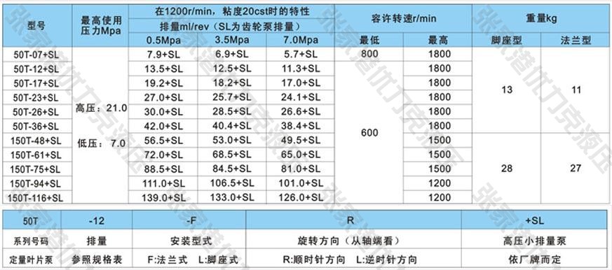 1、50T一07+SL的“SL”為高壓小排量泵之規(guī)格(排量)在組裝尺寸許可下,可搭配任何廠牌。